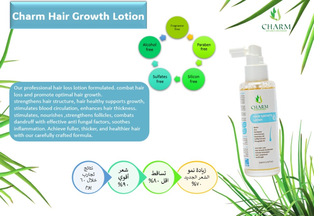 فكل هذا يوفره لك لوشن نمو وعلاج تساقط الشعر من تشارم, لاحتواه على تركيبة مبتكرة مميزة تجمع كل الفوائد السابقة بفضل احتوائه على ( الزنك – مستخلص الأملا – الكافيين – اكليل الجبل – البيوتين – البانثينول ) فهذة التركيبة تعمل بصورة عالية على زيادة مرحلة نمو الشعر وتقليل مرحلة السقوط ليزيد عمر الشعر وبالتالي يزيد طولة وكثافتة ويقل تساقطة, علاوة على ما سبق فإن لوشن النمو من تشارم يساعد على تقليل فعالية الانزيم المسبب للتساقط الهرموني او الوراثي لزيادة مرحلة نمو الشعر حتى تثبت الشعرة في المنبت بصورة أقوى مما يجعلها تستقر حتى 3 سنوات ليقل تأثير التساقط الهرموني ويزيد طول وكثافة الشعر بصورة واضحة,